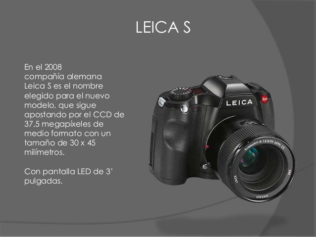 17. LEICA S En el 2008 compañía alemana Leica S es el nombre elegido para el nuevo modelo, que sigue apostando por el CCD de 37,5 megapíxeles de medio formato con un tamaño de 30 x 45 milímetros. Con pantalla LED de 3’ pulgadas.