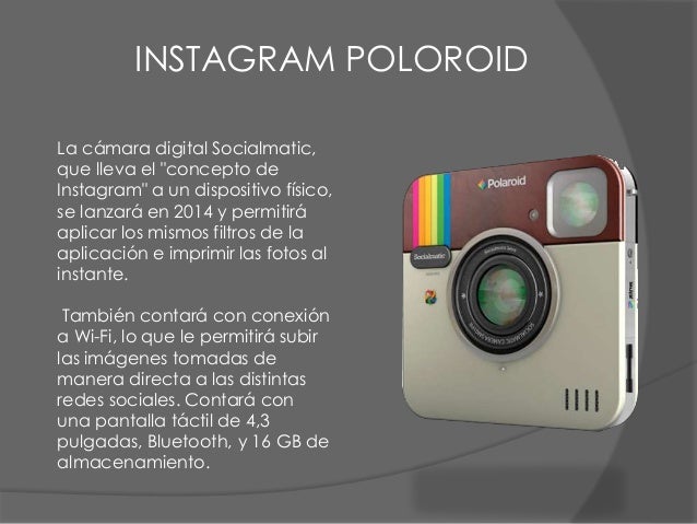 19. La cámara digital Socialmatic, que lleva el «concepto de Instagram» a un dispositivo físico, se lanzará en 2014 y permitirá aplicar los mismos filtros de la aplicación e imprimir las fotos al instante. También contará con conexión a Wi-Fi, lo que le permitirá subir las imágenes tomadas de manera directa a las distintas redes sociales. Contará con una pantalla táctil de 4,3 pulgadas, Bluetooth, y 16 GB de almacenamiento. INSTAGRAM POLOROID