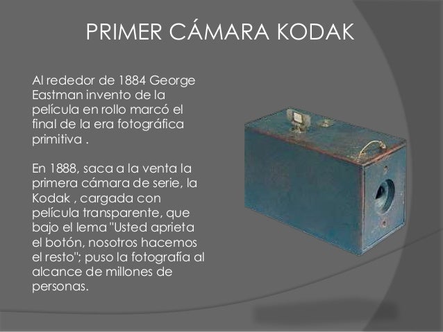 4. Al rededor de 1884 George Eastman invento de la película en rollo marcó el final de la era fotográfica primitiva . En 1888, saca a la venta la primera cámara de serie, la Kodak , cargada con película transparente, que bajo el lema «Usted aprieta el botón, nosotros hacemos el resto»; puso la fotografía al alcance de millones de personas. PRIMER CÁMARA KODAK