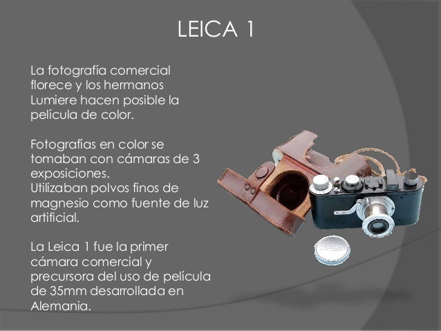 5. La fotografía comercial florece y los hermanos Lumiere hacen posible la película de color. Fotografías en color se tomaban con cámaras de 3 exposiciones. Utilizaban polvos finos de magnesio como fuente de luz artificial. La Leica 1 fue la primer cámara comercial y precursora del uso de película de 35mm desarrollada en Alemania. LEICA 1