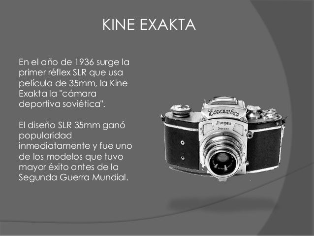 6. En el año de 1936 surge la primer réflex SLR que usa película de 35mm, la Kine Exakta la «cámara deportiva soviética». El diseño SLR 35mm ganó popularidad inmediatamente y fue uno de los modelos que tuvo mayor éxito antes de la Segunda Guerra Mundial. KINE EXAKTA